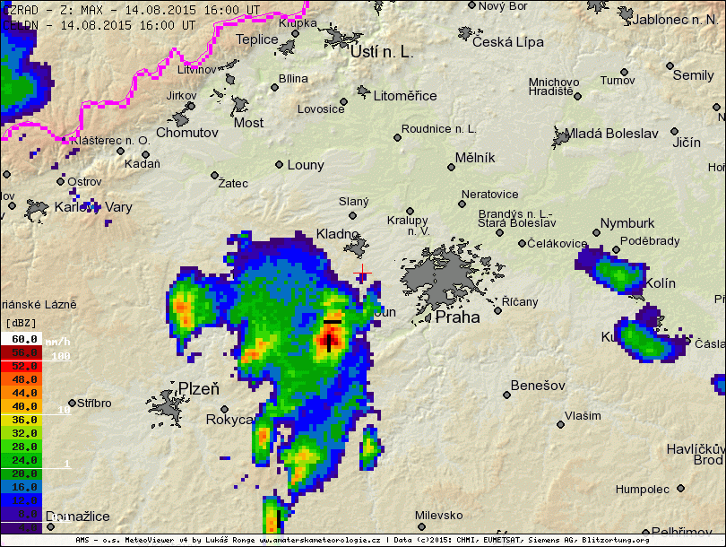Blížil se víkend, tropické teploty měly začít pomalu ustupovat a modely naznačovaly, že by oba víkendové dny mohlo zabouřit. Předchozí dny se bouřková činnost odehrávala především nad východní půlkou ČR a na Slovensku a ne jinak tomu bylo zpočátku i v pátek 14. srpna. Těšili jsme se na víkend snad proložený výjezdy za bouřkami, ale tento den jsme spíš přemýšleli, zda se ještě po práci nejet vykoupat, když teploty stoupaly vysoko nad 30°C. Naštěstí jsme se ale rozhodli zůstat doma, což bylo možná způsobeno i tím, že jsme se nemohli ani při pátku včas „utrhnout“ z práce, a tak, než jsme se dostali domů a trochu se občerstvili svačinou, byl prakticky večer. Navíc pohled na radar nás zrazoval od unáhleného výletu bez fotovýbavy. Na Moravě „to“ už nějakou dobu poctivě bouřilo a na západě se taky něco dělo, ale zatím se to jevilo nepřesvědčivě. Nicméně kolem 5. hodiny odpolední se přeci jen konvektivní činnost v okolí Plzně rozrůstá jak vertikálně tak i horizontálně a zdá se, že vývoj bouřek je nevyhnutelný. Tvoří se několik oddělených bouřkových buněk a ty se vydávají na svou cestu prakticky směrem k severu.