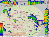| Radarový zoom s detekcí blesků CELDN zobrazující bouřku blížící se na Kladensko. Křížek značí Unhošť. © Český hydrometeorologický ústav, Siemens AG, Vaisala Oyj Velikost: 257 kB |