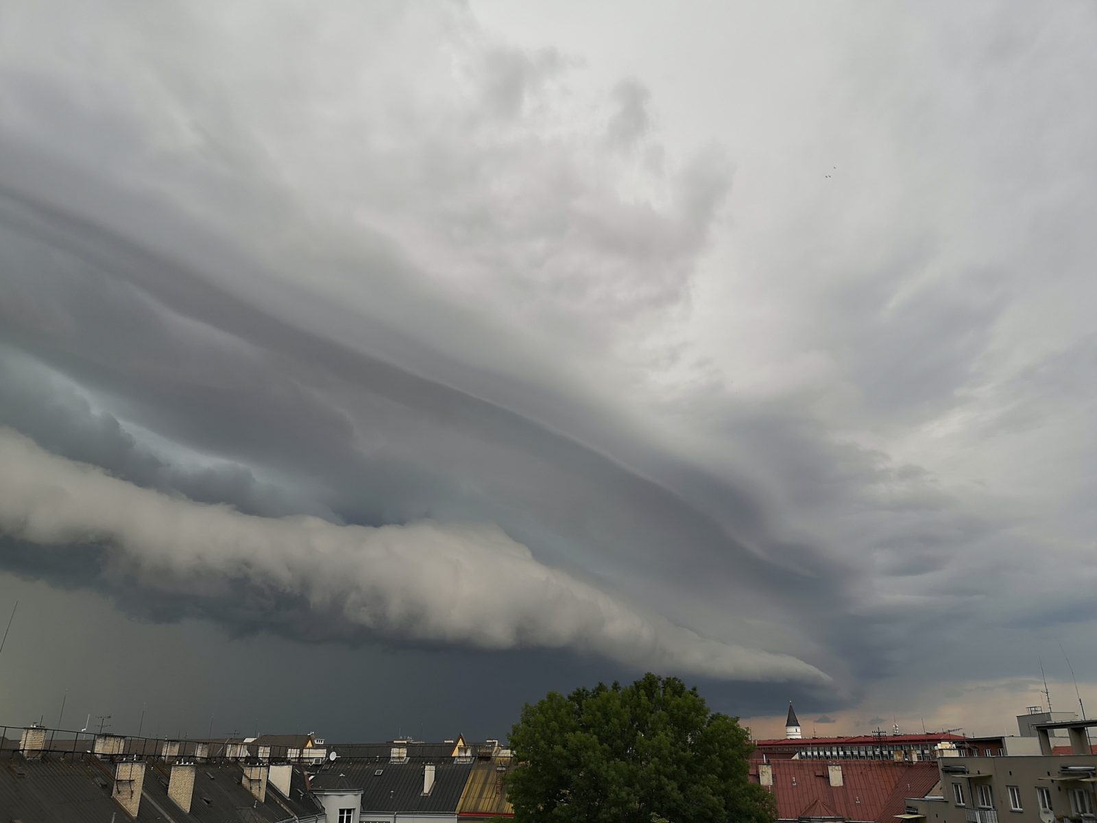 Odpoledne se krátce ukázalo sluníčko, ale bylo velice dusno, i díky výparu z předchozí bouřky. Od západu se blížila nová hradba cumulonimbů a kovadlin, tvořila se linie bouřek a po čase se nad obzorem dal rozpoznat i dlouhý shelf cloud. A ten se pomalu blížil, mohutněl a krásněl. Díky vlhku byl velmi nízko nad zemí a byl opravdu nádherný, byť jižněji ve Zlínském kraji byl ještě o několik levelů hezčí. Ale člověk nemůže mít všechno… Jinak bouřka to byla celkem mírná, bez škod, spadlo jen kolem 5 mm srážek.