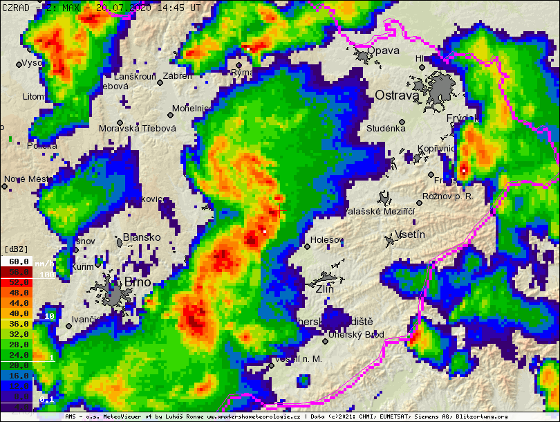 V pondělí 20. července přecházela přes Česko slabá studená fronta od západu v brázdě nižšího tlaku. Modely slibovaly teplé a vlhké labilní počasí, bez extrémních jevů. Polední sondážka z Prostějova ukazovala mírnou labilitu (ML CAPE kolem 500 J/kg) a ne moc velký střih větru (DLS 0-6 km 11 m/s). Estofex dával pro Moravu „žlutou“, tedy poměrně četné bouřky, které ale neměly splňovat parametry pro stupeň 1.