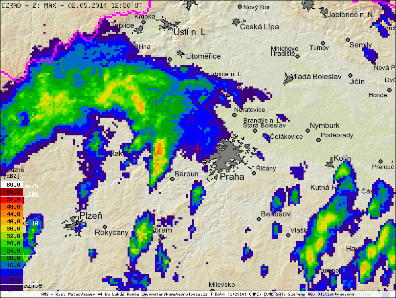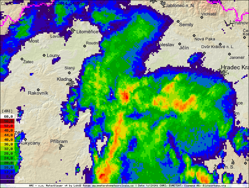 | Radarová animace v zoomu v rozmezí od 14:30 – 16:00 SELČ zobrazující kroupové jádro kolem pražského letiště. © Český hydrometeorologický ústav Velikost: 3612.3 kB |