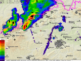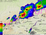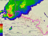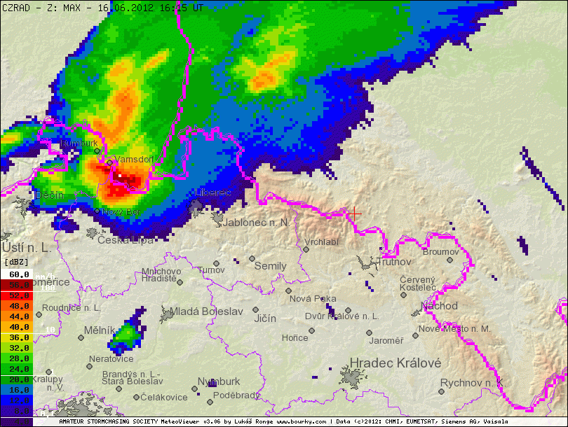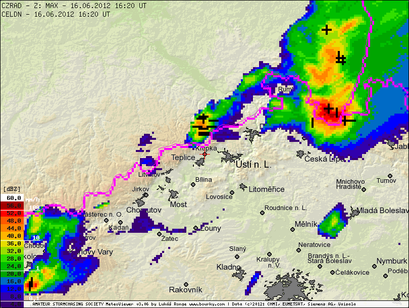 | Radarový zoom zobrazující silnou bouři na Teplicku. Křížek značí Krupku. © Český hydrometeorologický ústav, Siemens AG, Vaisala Oyj Velikost: 108.7 kB |
