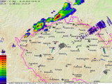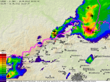 | Radarový snímek ukazující mimo jiné outflow od bouře tou dobou již na Liberecku, které „podřízlo“ bouři na západě. © Český hydrometeorologický ústav, Siemens AG, Vaisala Oyj Velikost: 139.3 kB |