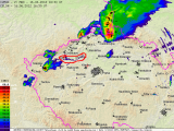 | Radarový snímek ukazující první výraznější bouřkový vývoj nad Krušnými horami. © Český hydrometeorologický ústav, Siemens AG, Vaisala Oyj Velikost: 144.1 kB |