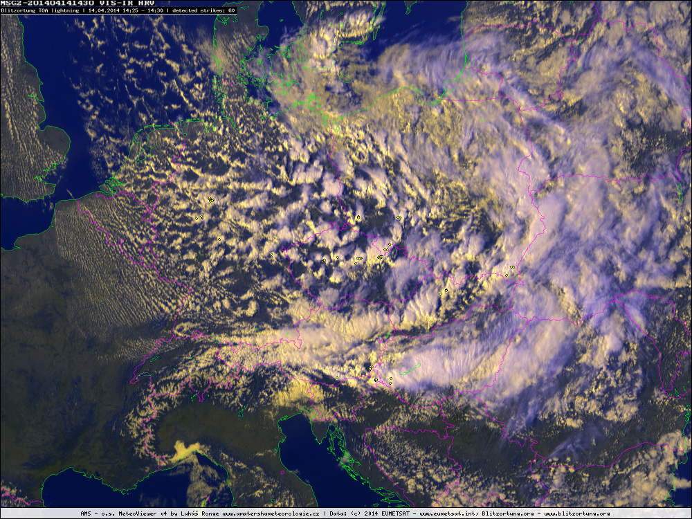 | Družicový snímek v pseudoviditelném spektru s detekcí blesků Blitzortung. © EUMETSAT, Blitzortung Velikost: 1461.4 kB |