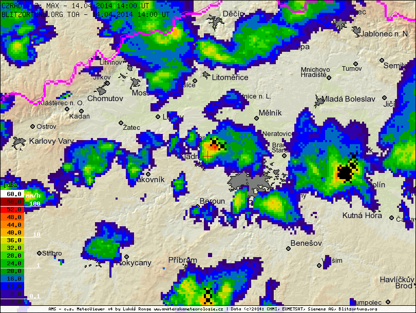 | Místa s bouřkou 14.4.2014 na základě detekční sítě Blitzortung. © Blitzortung Velikost: 93.6 kB |
