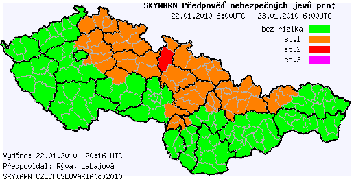 až na hodnoty pod -15°C, zejména pak v údolních oblastech. Obdobný pokles teploty nelze vyloučit ojediněle i mimo vyznačené oblasti pokud v některé další dojde během noci k vyjasnění. Naopak nelze vyloučit možnost vytvoření mlhy/ nízké oblačnosti i ve vyznačené oblasti a tak zpomalení popř. zastavení poklesu teploty. Vyznačeny jsou najpravděpodobnější oblasti kde lokálně může docházet k poklesu teploty pod -15°C, což odpovídá limitu pro 1. stupeň. Vyjímku zde tvoří oblast Šumperska, kde jsme vydali stupeň 2 vzhledem na aktuální teplotu kolem -18°C na stanici Šumperk. Nelze vyloučit, že zde ojediněle dojde k poklesu teploty pod -20°C, zejména pak v údolích na sněhové pokrývce.
